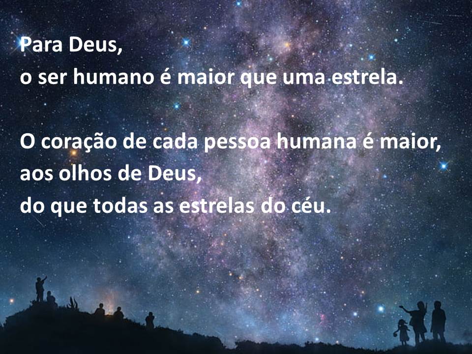 Sementinhas da Palavra – 12/05/22 Deus criou o ser humano à sua imagem, à imagem de Deus o criou. (Gn 1,27) Para Deus,o ser humano é maior que uma estrela. O coração de cada pessoa humana é maior,aos olhos de Deus,do que todas as estrelas do céu. Compartilhe isso: Clique para compartilhar no X(abre em nova janela) 18+ Clique para compartilhar no Facebook(abre em nova janela) Facebook Curtir Carregando... Relacionado